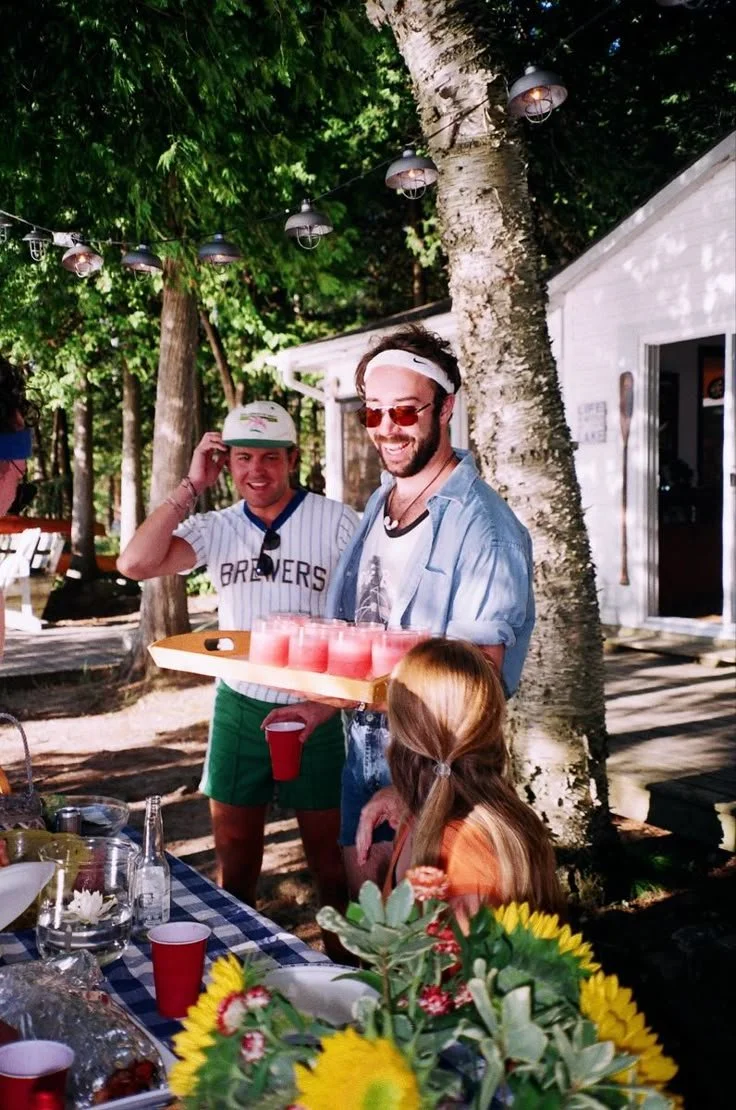 A lighthearted mocktail moment captures the carefree joy of summer camp, team members laughing, sharing drinks, and soaking up the sunshine in a laid-back outdoor setting.